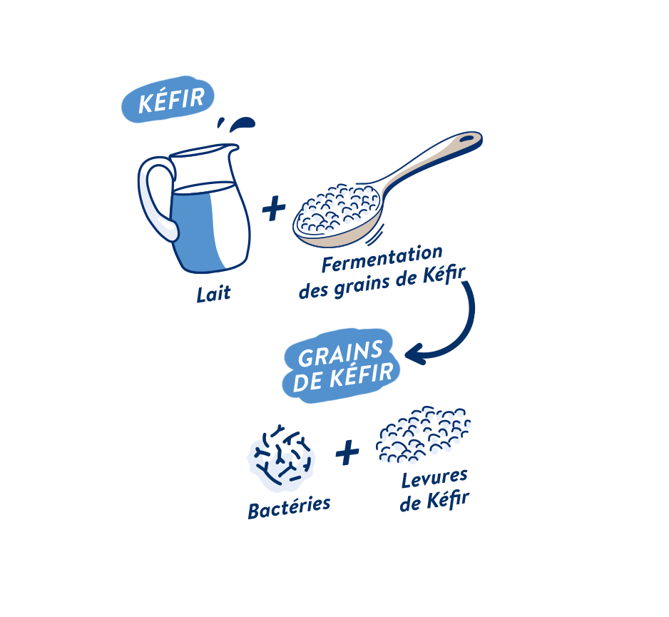 Connue pour ses bienfaits, cette boisson lactée est traditionnellement fermentée avec des grains de Kéfir. Ces grains de Kéfir sont formés à partir de levures de kéfir et de nombreuses bactéries, certaines appelées probiotiques, bénéfiques pour la flore intestinale.